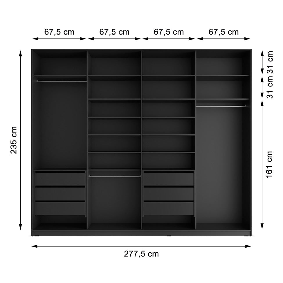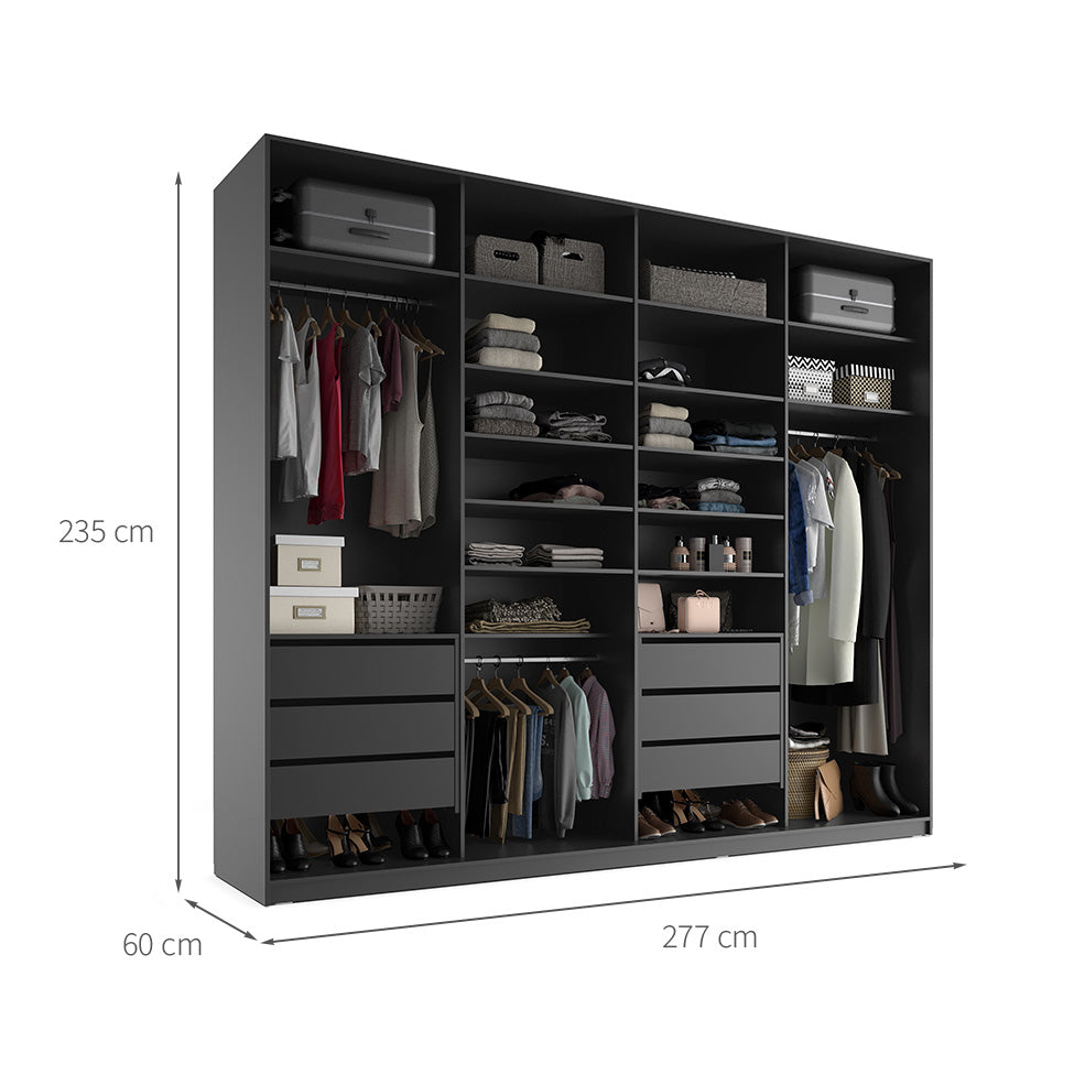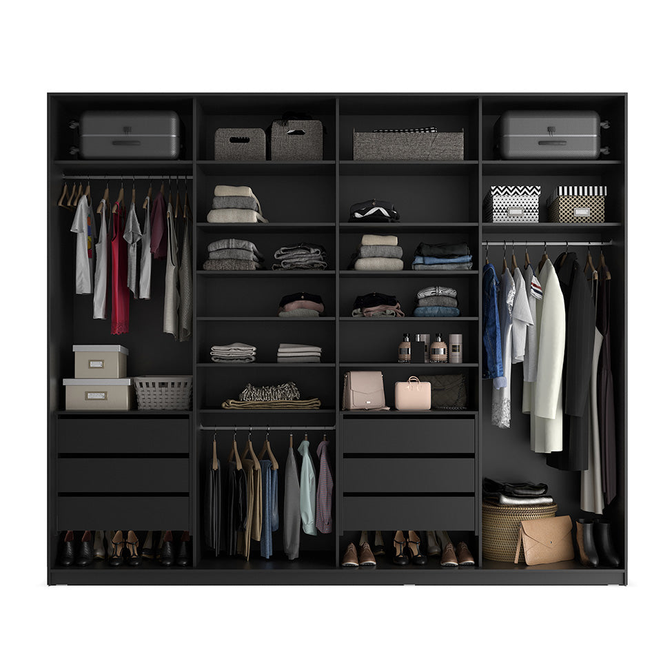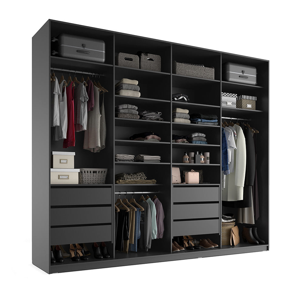 ESPACIO DE ALMACENAMIENTO DISEÑADO PARA GUARDAR ROPA, CALZADO Y ACCESORIOS. EMPOTRADO SIN PUERTAS. INCLUYE REPISAS, CAJONES, BARRA PARA COLGAR PRENDAS Y COMPARTIMENTOS PARA MAYOR ORGANIZACIÓN.